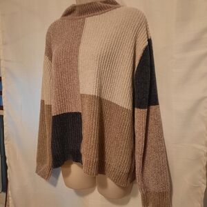 Embrace warmth and elegance with this patchwork turtleneck sweater. Featuring a harmonious blend of cream, tan, and black, it's perfect for any casual occasion.