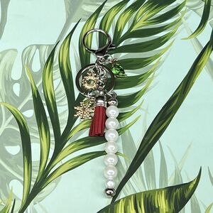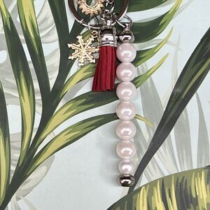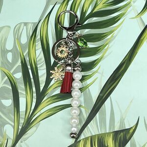 This Pearl Bag Charm Keychain is a handmade accessory designed for women, showcasing a festive Christmas theme with a touch of elegance. The keychain features a versatile design with a genuine suede tassel accent, beaded detailing, and a beautiful wreath, snowflake & leaf charms. Made with faux pearls, metal, and suede materials, this detachable and multifunctional charm is perfect for adding a touch of style to your keys or bag. This unique and eye-catching accessory is sure to add a touch of class and sophistication to your everyday look.