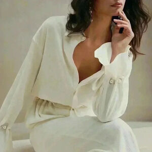 Elegant Pearl Decor Ruffle Sleeve Beige Blouse - Beige