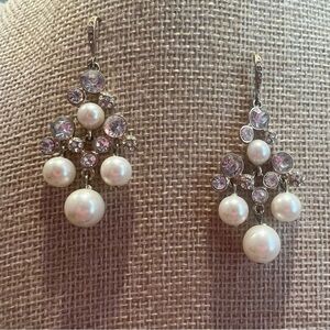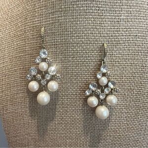 These stunning drop costume earrings feature elegant faux pearls and sparkling crystals, perfect for any occasion. The silver setting adds a touch of sophistication.