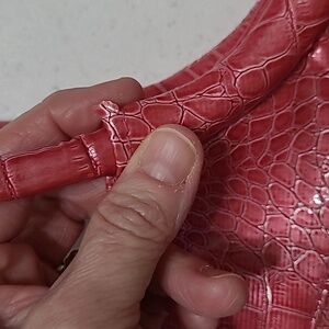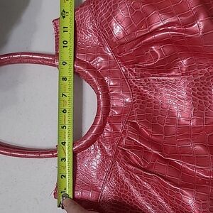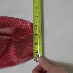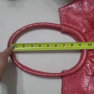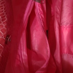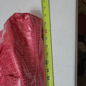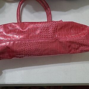 This stylish pink crocodile-embossed bag is perfect for any occasion. Its elegant design and vibrant color make it a standout accessory. Magnetic Snap closure. Has 1 pocket with a zipper on one side & a small pocket on the other side.