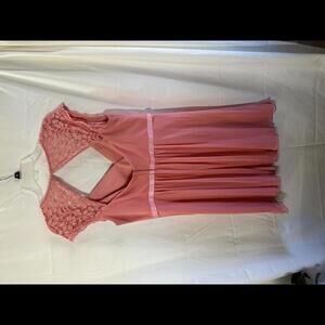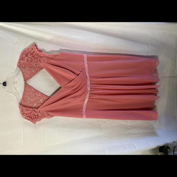 Step into elegance with this beautiful pink midi dress by David's Bridal, perfect for special occasions or summer gatherings. The dress features a stunning lace cap-sleeve design and a flattering cross-over bodice, enhancing your silhouette. The soft, flowy fabric is made of 100% polyester, ensuring comfort and breathability. Key features include: