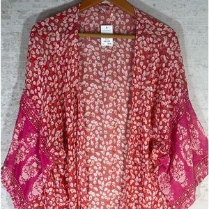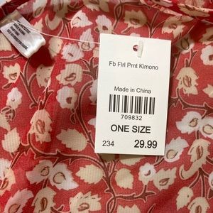 This elegant pink floral kimono adds a touch of sophistication to any outfit. Perfect for layering, it features a beautiful floral pattern that stands out.