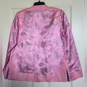 This elegant pink floral jacket is perfect for adding a touch of sophistication to any outfit. The intricate floral design enhances its stylish appeal. Ideal for both casual and formal occasions.