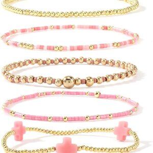 Features: This set includes 5 beautiful pink gold bead bracelets, including a stylish boho-inspired cross bracelet. Wear them separately or stack them for a trendy layered look. Made with hypoallergenic, tarnish-free 14K gold plating, these bracelets are gentle on sensitive skin and perfect for all-day wear.