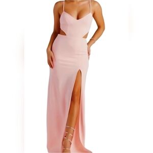 Stunning pink halter dress with a shimmering finish. Perfect for special occasions. *Stock photo to show fit*