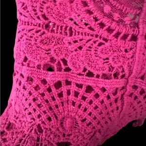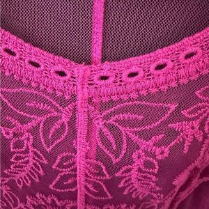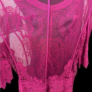 Elegant and fun Pink Lace / embroidered sheer Women's over blouse or swim cover 3/4 sleeves size medium. I removed the tag because I didn’t like seeing it when I was wearing the top so I’m not sure about the brand. The p to p measurement is approx 20”. Looks so cute with a white cami and white jeans- perfect for summer or spring.