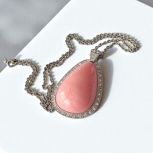 This stunning pink teardrop pendant necklace is perfect for adding a touch of elegance to any outfit. Surrounded by shimmering stones, it offers a sophisticated look.