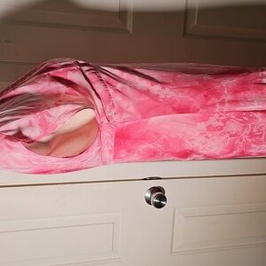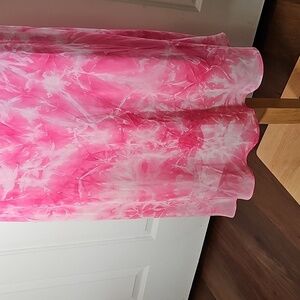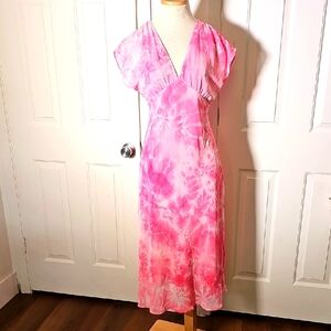 Step out in style with this elegant pink tie-dye chiffon overlay. maxi dress. Perfect for any occasion, this dress offers a flattering fit and a vibrant color that stands out. Kimono style slip dress. very good used condition and quality. Size 8 bust is about 16" Waist about 14". The top to bottom length is 50".