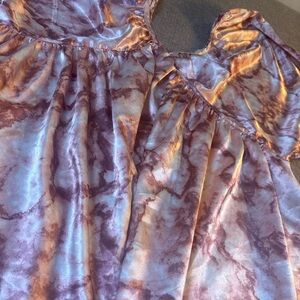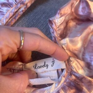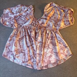 Gorgeous Lovely J satin puff sleeve blouse in a pink, peach, and cream tie-dye marble pattern.