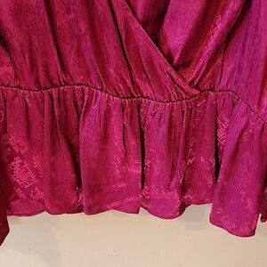 This elegant pink wrap blouse offers a stylish and comfortable fit. Perfect for any occasion. gathered sleeves fuscia colored