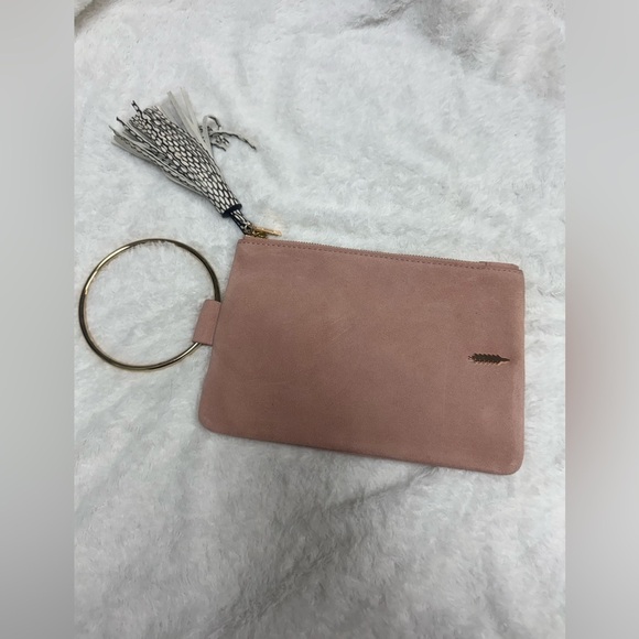 Chic and stylish pink wristlet clutch with a gold ring accent. Perfect for any occasion.