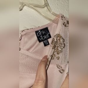Stunning pink gown with gold floral accents. Features a delicate ribbon tie.