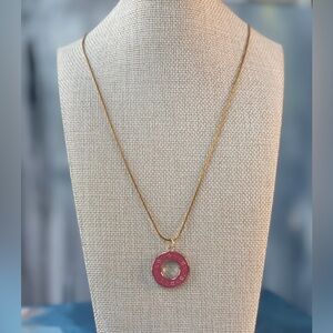 This stunning necklace features a pink and gold LV inspired pendant, perfect for adding a touch of elegance to any outfit. The intricate design makes it a standout piece in any jewelry collection.