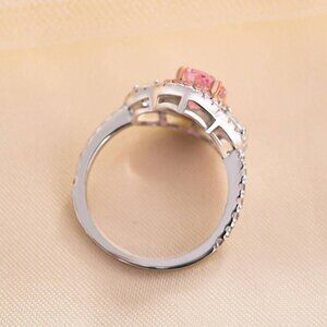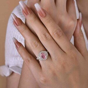 This stunning ring features a captivating pink center stone, beautifully surrounded by a double halo of shimmering diamonds.