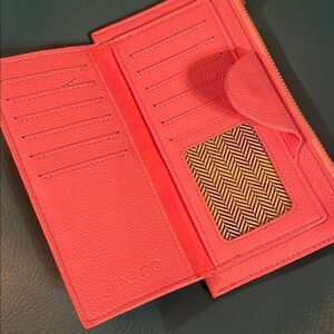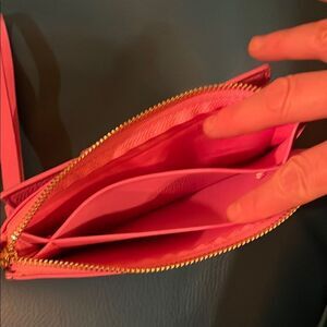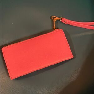 This stylish pink wristlet clutch combines elegance and practicality, featuring a sleek design and a convenient wrist strap. The gold-tone hardware adds a touch of luxury, making it a versatile accessory for any occasion.