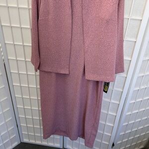 This lovely two-piece set features a soft pink jacquard fabric with an allover subtle paisley pattern for a classic, refined look. The set includes a sleeveless knee-length dress with a matching open-front jacket that offers effortless coverage and sophistication. The jacket has a clean, collarless design and three-quarter sleeves, creating a polished silhouette perfect for church, weddings, formal gatherings, or special occasions. Comfortable, timeless, and flattering.