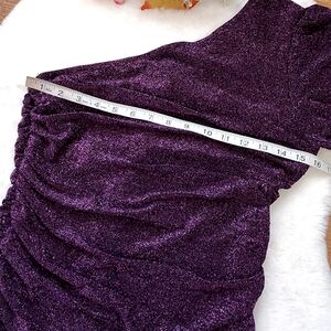 Step out in style with this elegant purple one-shoulder dress. Perfect for any occasion, this dress combines sophistication with a modern twist. The rich purple hue and shimmery metallic sparkle adds a touch of luxury to your wardrobe.