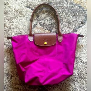 This stylish Longchamp purple tote bag is perfect for any occasion. Its sleek design and vibrant color make it a must-have accessory. In good condition. Bag has gold hardware. Bag is the small size.