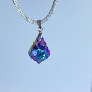 Just beautiful when the sun strikes through the charm and sparkles! On satiny cordage. This stunning drop pendant/car charm. features a vibrant purple and blue drop design, perfect for adding a pop of color to your car rear view mirror. The unique drop shape adds a touch of elegance and style. Adjustable