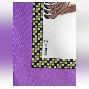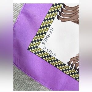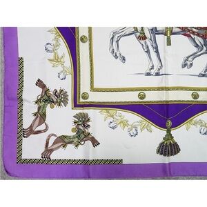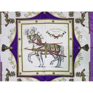 Stylish scarf featuring an equestrian design. Dominant colors are purple and white.