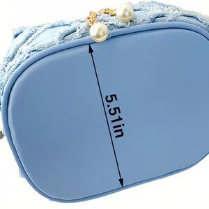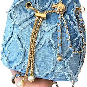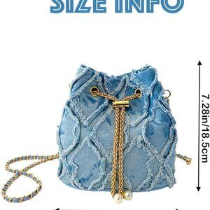 Features: Stylish washed denim with a vintage vibe, featuring a unique gradient and distressed details. Adjustable crossbody strap with a sleek gold chain, metal drawstring closure for quick access, and a compact size perfect for your essentials. Comes with two versatile hair scarves to spice up your look.