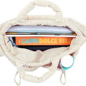 Features: This lightweight quilted puffer tote feels as cozy as a pillow, offering padded protection with a chic, classic tote silhouette. Big enough to fit a 14-inch laptop, with a spacious main compartment, a secure zip inner pocket, and quick-access front pockets. Plus, it easily switches from tote to backpack, with adjustable straps for a hands-free option or a compact shoulder bag. Made from durable, water-resistant nylon that’s easy to wipe clean.