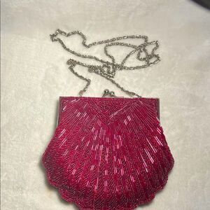 This elegant pink beaded clutch is perfect for adding a touch of glamour to any outfit. The intricate beadwork and chic design make it a standout accessory for special occasions. See pics for measurements. Chain approx. 20”