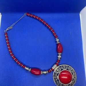 This elegant red beaded necklace features an intricate pendant, perfect for adding a touch of sophistication to any outfit. Ideal for both casual and formal occasions.