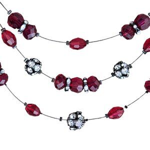 This elegant multi-strand necklace features vibrant red beads and shimmering silver accents. Lightweight and stylish, it is suitable for formal or casual wear.