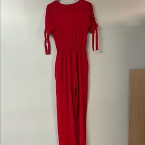 This elegant red dress features a stylish button-down front and tie sleeves, perfect for any occasion.