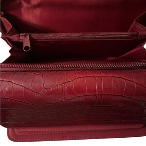 This stylish red clutch features a sophisticated crocodile-embossed design. Perfect for adding a touch of elegance to any outfit.