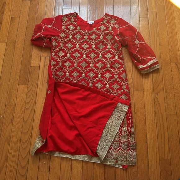 This elegant red dress features intricate embroidery, perfect for any special occasion. The vibrant color and detailed design make it a standout piece in any wardrobe.
