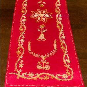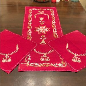 Enhance your dining experience with this elegant red embroidered table runner and napkin set. Perfect for adding a touch of sophistication to any meal.