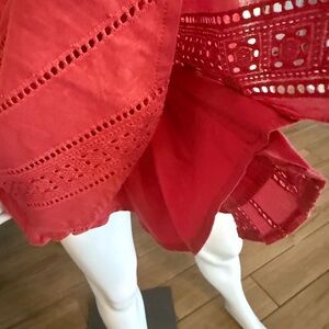 This elegant dusty pink/ red eyelet dress is perfect for any occasion. Its intricate design and flattering fit make it a must-have in your wardrobe. Smocking at the back for a nice fit. Puff sleeves. Mini length with lining. Size xs. Happy to give measurements upon request!