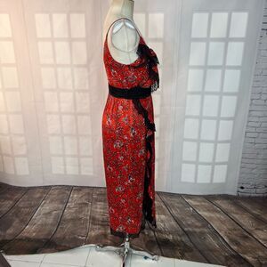 Step out in style with this elegant red floral midi dress. Perfect for any occasion, this dress features a stunning floral pattern that adds a touch of sophistication. Pair it with your favorite accessories for a complete look.