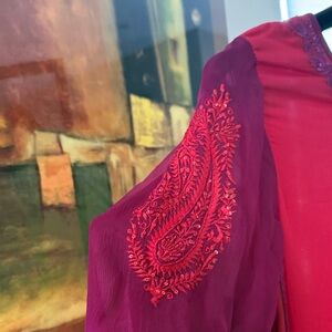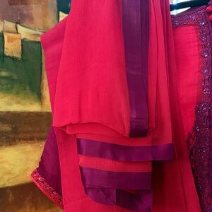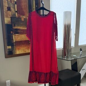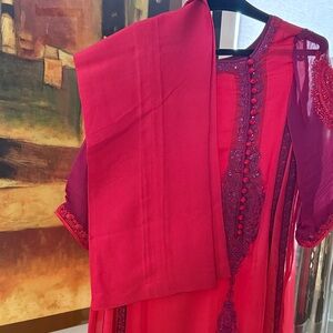 This elegant long sleeve dress features a stunning red hue, perfect for any occasion. The intricate detailing adds a touch of sophistication. Ideal for those who appreciate high end style and comfort. It is paired with pure raw silk culottes and pure French chiffon dupatta.
