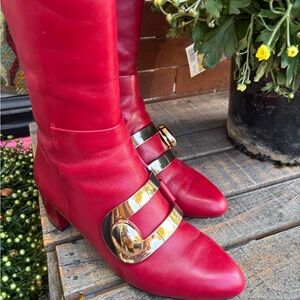 Elegant Red Over-the-Knee Boots with Gold Buckle