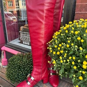 Make a statement with these stunning red over-the-knee boots, featuring a chic gold buckle detail. Perfect for elevating your style with a touch of elegance.