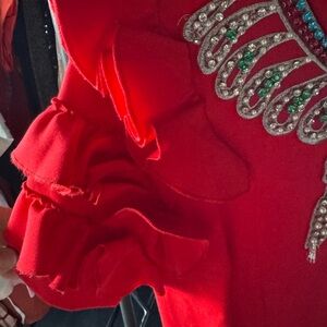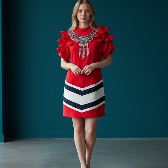Stand out in this elegant red dress featuring stylish ruffles and a chic design. Perfect for any occasion.