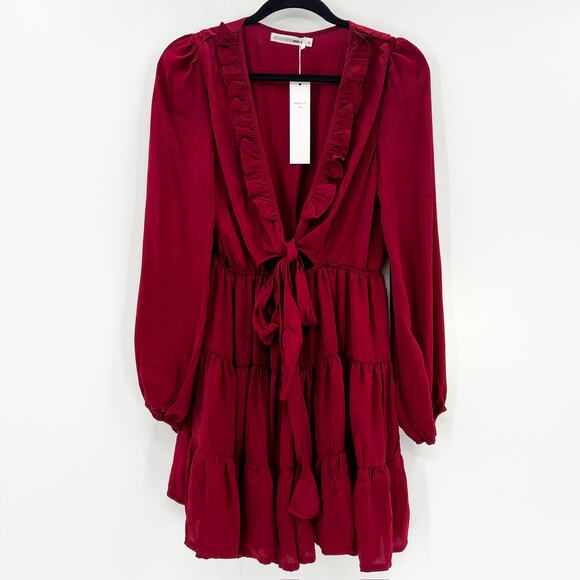 This elegant red mini dress features charming ruffles and a flattering tie-front design. Perfect for any occasion, it offers a stylish and comfortable fit.