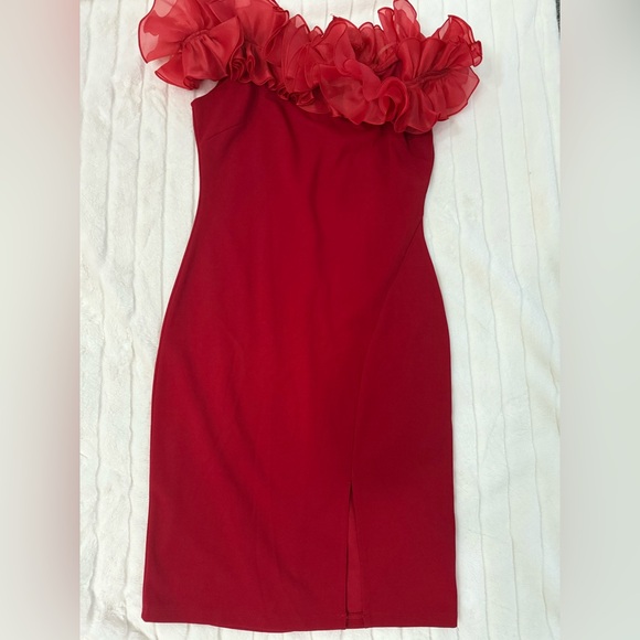 Turn heads with this stunning red ruffle off-shoulder dress. Perfect for Valentines Day