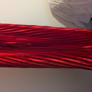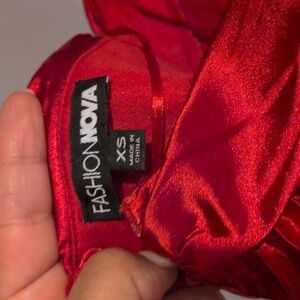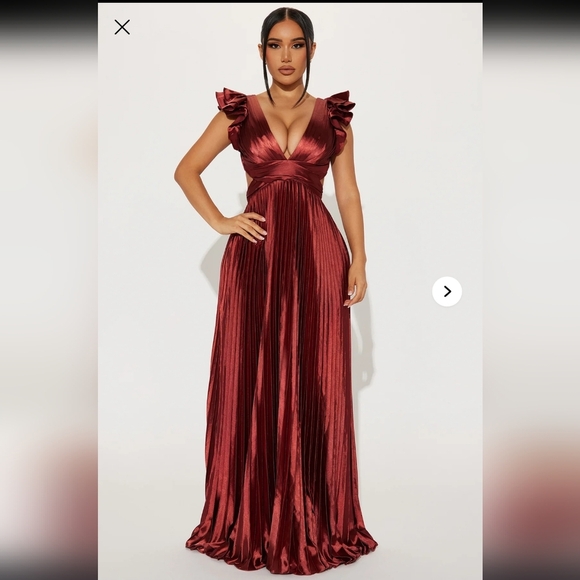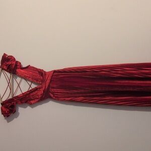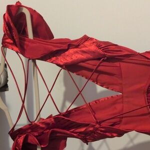 Stunning red dress with ruffled sleeves and crisscross back. Perfect for special occasions.