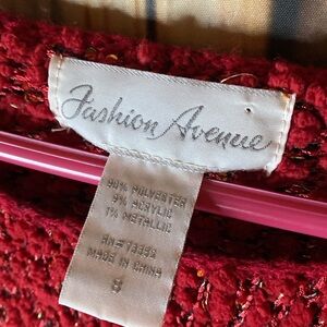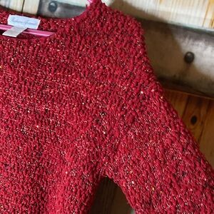 Add a touch of glamour to your wardrobe with this stunning red chenille sweater. It has sequins and metallic thread all throughout. Perfect for any occasion.
