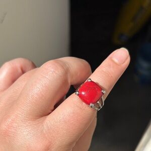 This elegant ring features a striking red stone set in a sleek silver band. Perfect for adding a pop of color to any outfit.