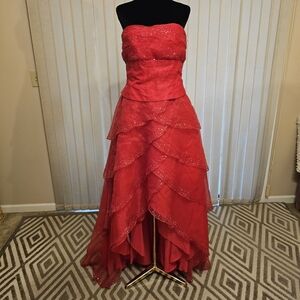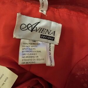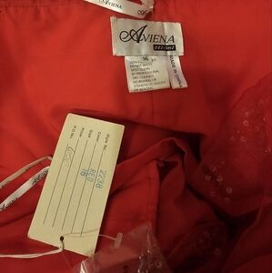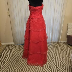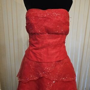 Aviena, make a statement with this stunning red strapless evening gown. Perfect for formal occasions, this dress features a layered design that adds elegance and sophistication. See pics. Some beading is missing.