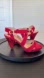 Step out in style with these elegant red strappy heels. Perfect for any occasion, these shoes offer both comfort and sophistication. Suede straps and snakeskin heel. Fits 8 or 8.5