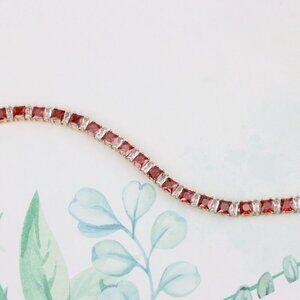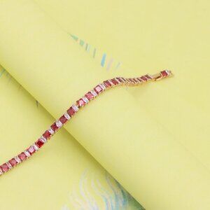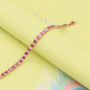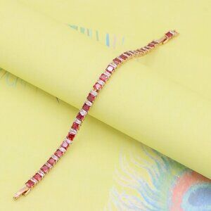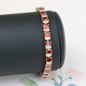 This stunning bracelet combines bold red and white baguette stones with premium rose gold plating over high-quality brass for a luxurious look.