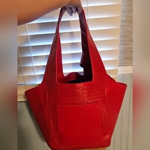 This stylish Sassy Jones red woven tote bag is perfect for any occasion. Its elegant design and vibrant color make it a standout accessory.