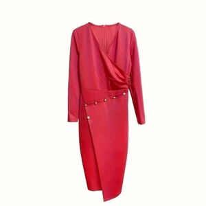 This elegant red wrap dress features a stylish design with button accents, perfect for any occasion.
